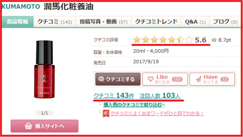 潤馬化粧養油はアットコスメ☆5.6の評価を受けています。
